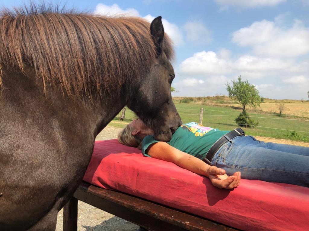 Een gouden regel in de haptotherapie, waar gewerkt wordt met bewustwording van houding en beweging, voelen en denken… maar ook bij paardencoaching! Paarden zijn meesters in het lezen van onze lichaamstaal en emoties. Hun reacties laten ons haarfijn zien wat we meer mogen doorvoelen, waarin we vrijer, opener of sterker kunnen worden. In het vredige samenzijn met de paarden en in de eenvoudige maar efficiënte oefeningen (naast het paard, op de grond) krijg je meer inzicht in jezelf door hun oordeel-loze feedback.