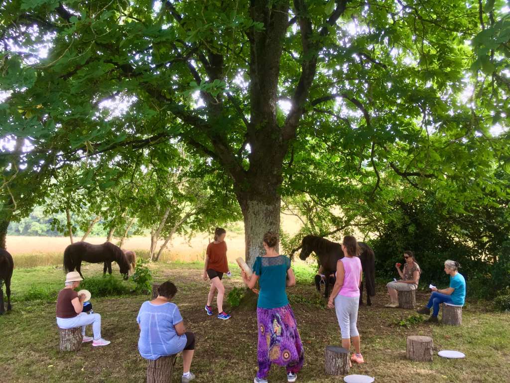 Malheureusement, Carole Raguenet ne pourra pas assister à cet atelier, suite à un imprévu d’ordre professionnel. Nous en sommes vraiment désolées. MAIS… Nous avons une remplaçante néerlandaise, la chanteuse de mantras et thérapeute sonore Wendy Vorstenbosch, qui séjourne chez nous ces jours-là. Le programme sera un peu adapté, avec le chant des mantras et des chants chamaniques, mais toujours en présence des chevaux. Et… baigné dans les énergies du solstice d’été, de la Fête de la Musique!