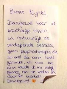Dankjewel voor de prachtige lessen en natuurlijk de verdiepende sessies. Geen psychotherapie die zo snel de kern heeft geraakt, en voor het eerst voelde ik me veilig genoeg om te voelen en door te werken.